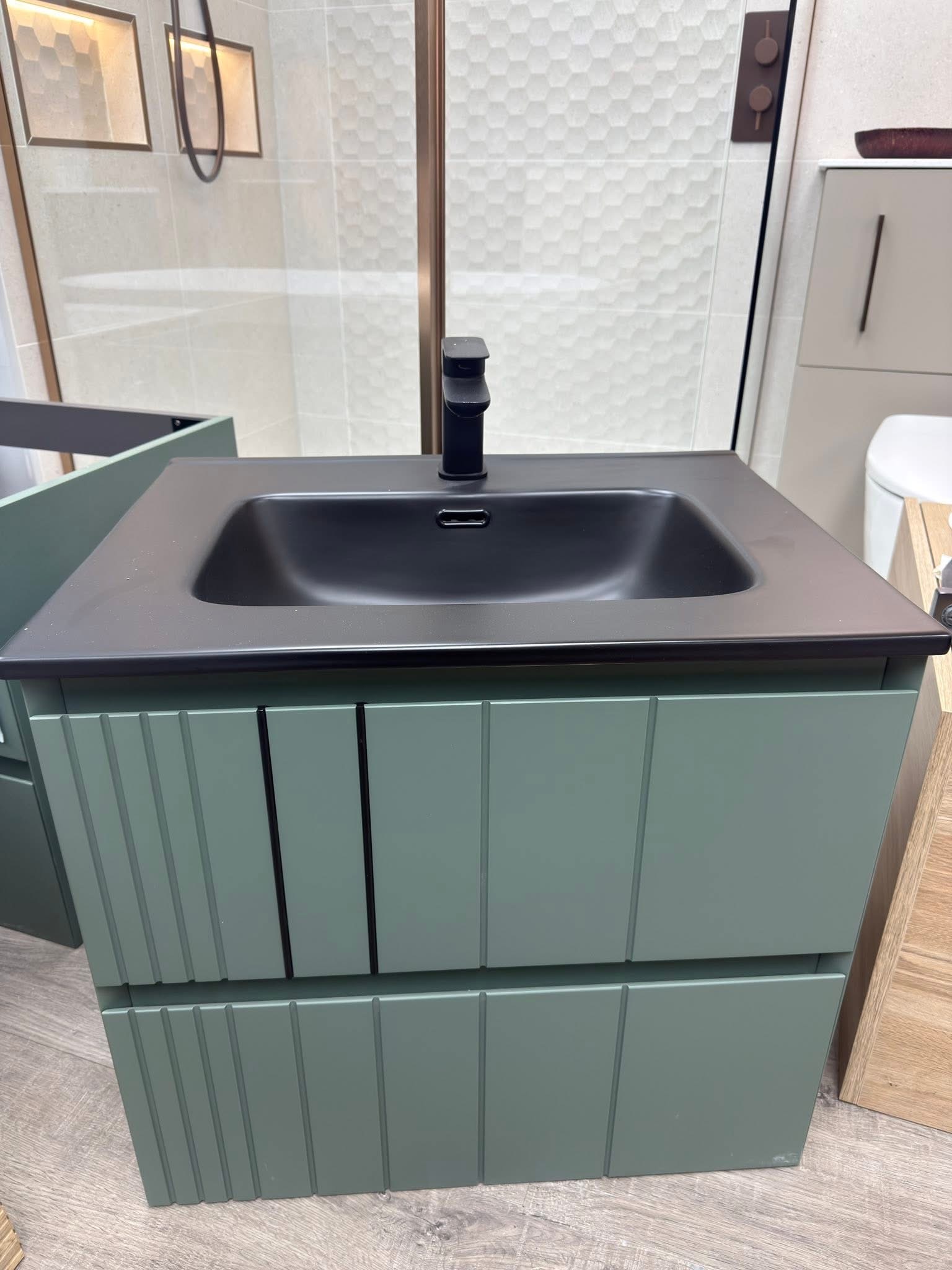 Stylish 600 x 450mm vanity unit complete with black basin and matching black tap, finished in a modern, on-trend design. Previously displayed in our showroom and maintained in excellent condition.